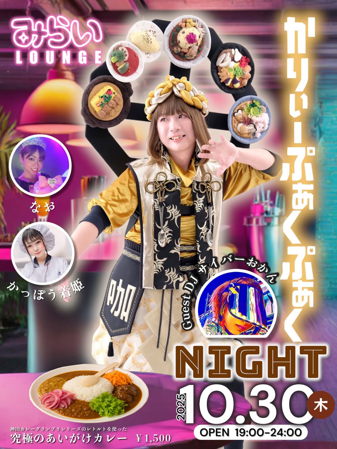 新宿二丁目のMIX BAR・みらいLOUNGEさんで、10/30(木)かりぃーぷぁくぷぁくNIGHTぶちかまさせていただきます!!神田カレーグランプリアンバサダーとして「究極のあいがけカレー」をご用意&ゲストDJとして「サイバーおかん」を招聘。スパイシーかつサイバーに盛りあがっていきましょ〜!!!